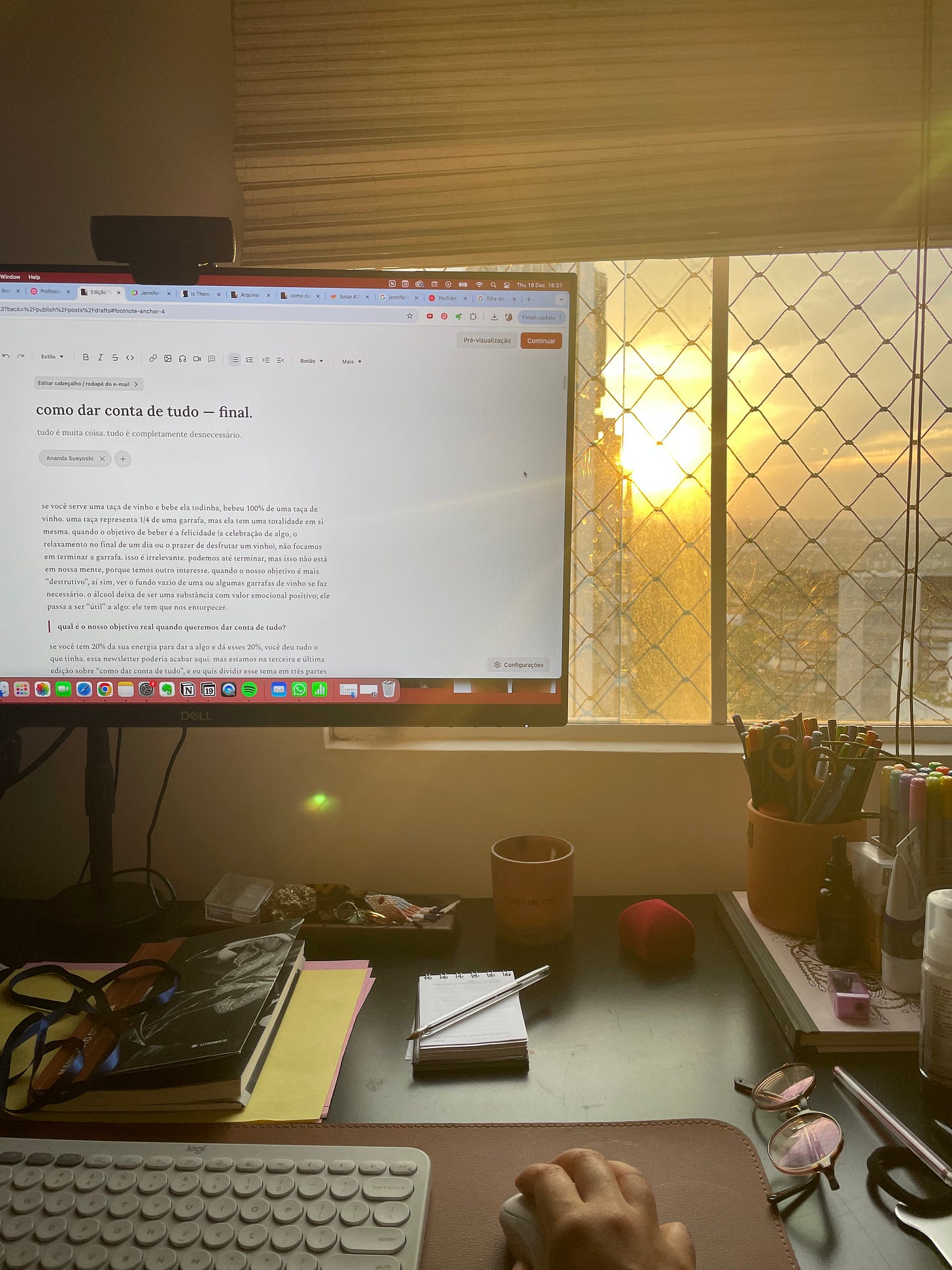 se você tem 20% da sua energia para dar a algo e dá esses 20%, você deu tudo o que tinha. essa newsletter poderia acabar aqui. mas estamos na terceira e última edição sobre “como dar conta de tudo”, e eu quis dividir esse tema em três partes para mergulharmos em cada uma delas.